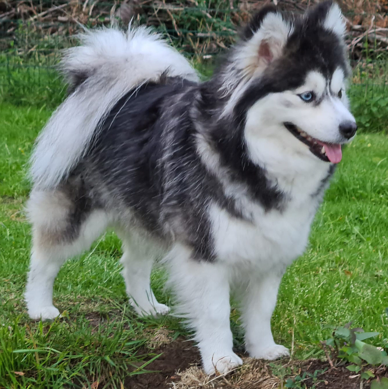 - Teef, pomsky F1, zwart-wit, 8kg, blauw en bruin oog (mama husky choco, papa pom wit)